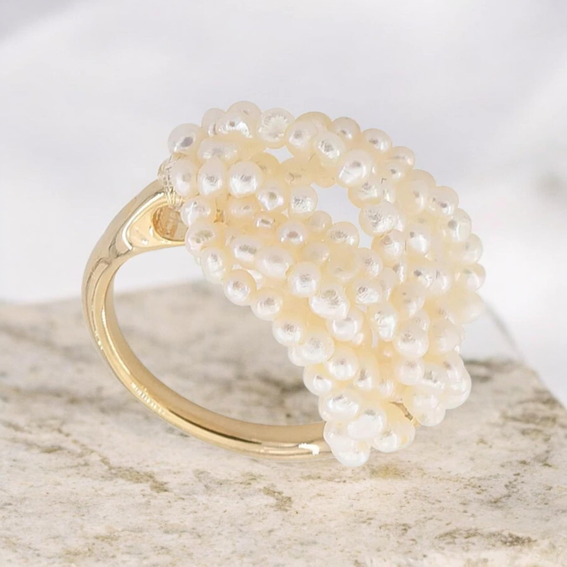 La Bague Perléane célèbre la délicatesse des perles naturelles dans un design moderne et sculptural. Chaque petite perle forme un relief organique et lumineux qui capture la lumière avec subtilité, donnant à la bague une allure à la fois poétique, intemporelle et résolument tendance.