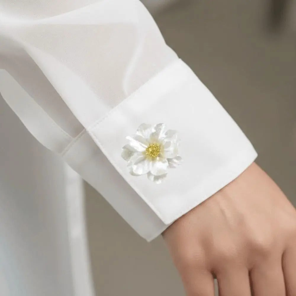 Pensés comme de véritables bijoux textiles, ils se fixent directement sur le bouton existant pour transformer instantanément une chemise classique en pièce élégante et féminine.
