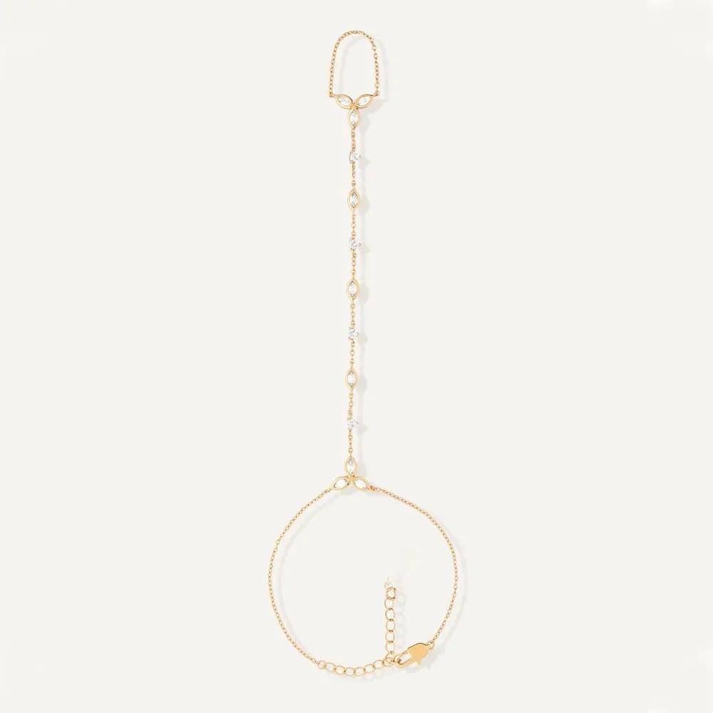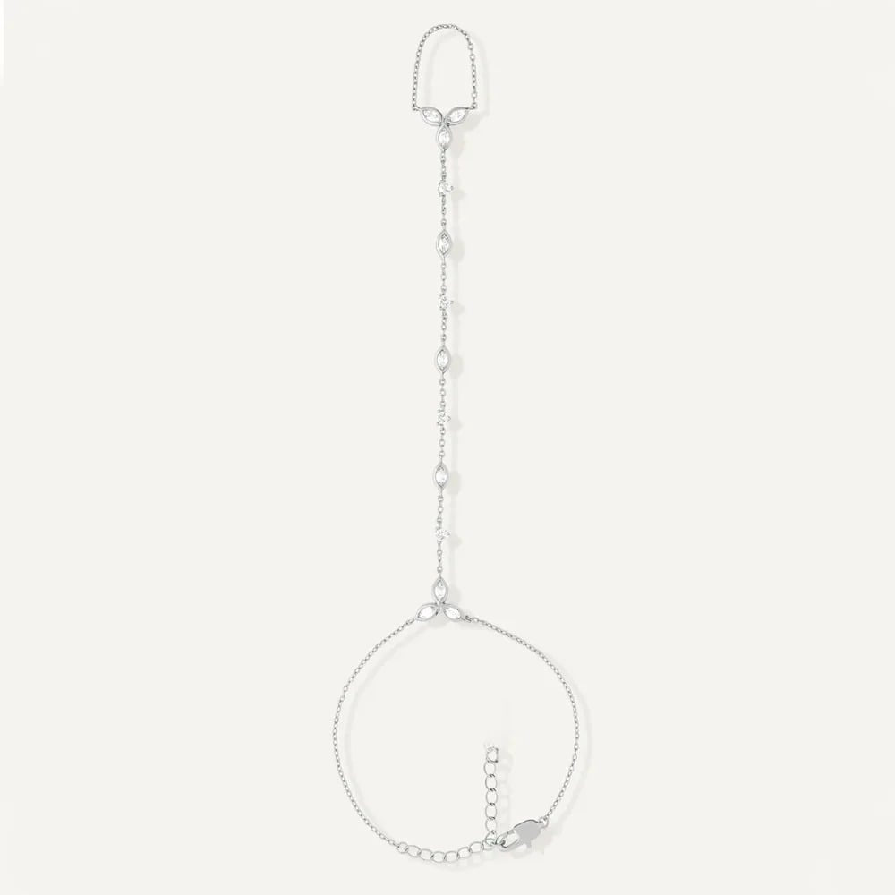 Son design fin, ponctué de zircons lumineux, relie le poignet au doigt pour créer un bijou aérien et résolument féminin. Une pièce subtile, idéale pour apporter une touche joaillerie à une tenue du quotidien comme à une occasion plus habillée.