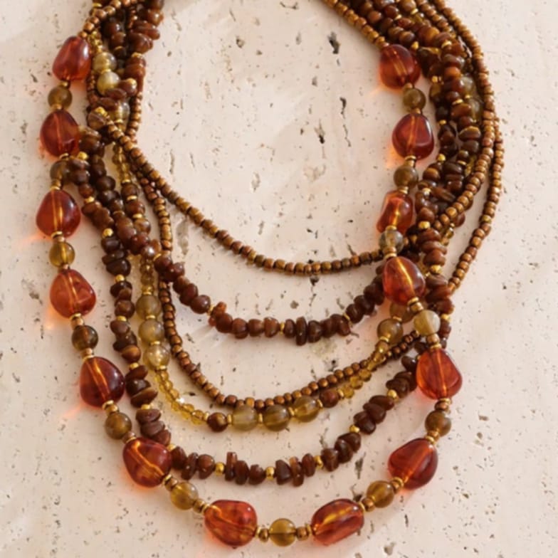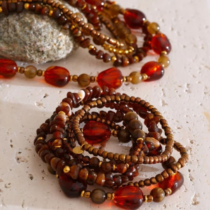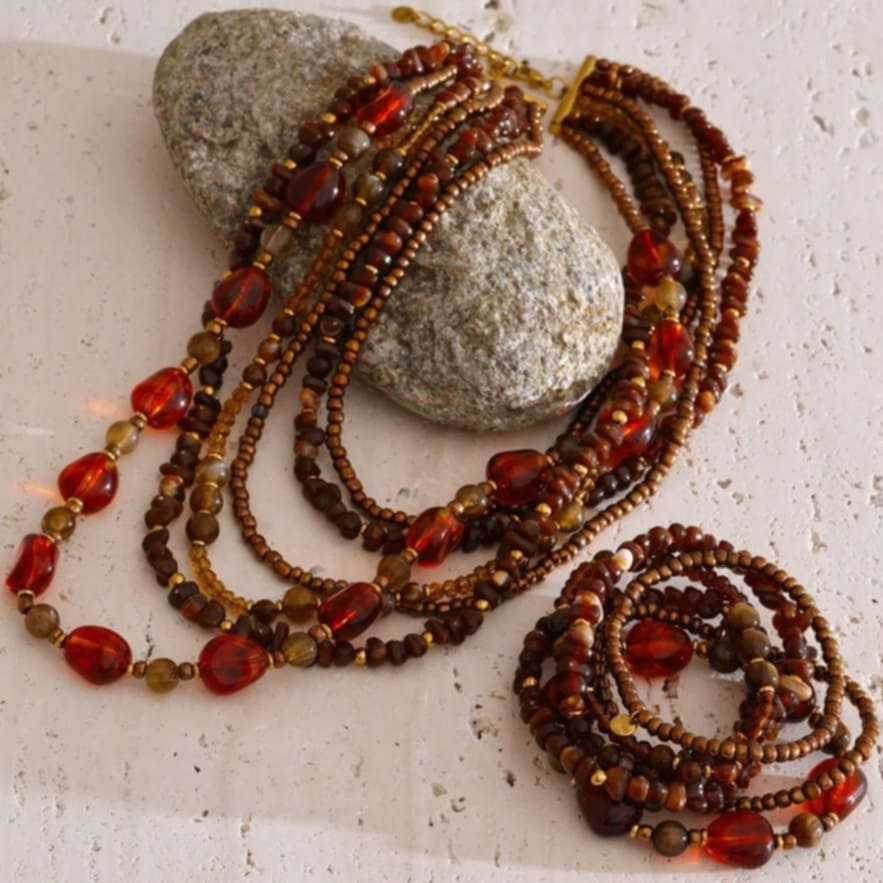Apportez chaleur et caractère à vos looks avec cet ensemble raffiné composé d’un collier multi rangs et d’un bracelet assorti. Ses nuances de brun, rouge ambré et doré rappellent les couleurs profondes de l’automne, pour une allure élégante et naturelle.